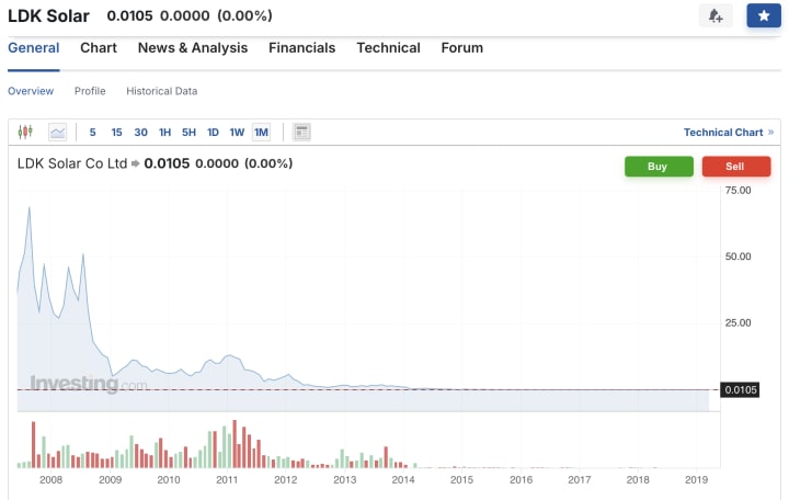 The first one was LDK Solar, a China-based solar wafer manufacturer that had a promising future and dominated the market in the early 2000s. I only bought three paper shares of it at $23 each in 2009 hoping it would recover from the down slide it started to experience. However, due to several compounding factors, such as global oversupply and price collapse, lack of demand and massive debt obligations, as well as subsidy cuts, the company had to restructure itself and ultimately filed for bankruptcy in 2014. For a long time, its shares were sitting in the OTC Pink market at under one cent per share, and I still sat on them, curiously watching (non)movement for almost 5 years. In 2019, I got a notification that the company was liquidated. I still have those paper shares somewhere in my office. Here's the LDK Solar Ltd stock price history: