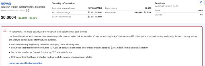 Finally, I also have 65 shares of Sunnova Energy Intl Inc., another solar energy company that had a lot of promise. I started buying its stock at about $25 in 2020 and bought the last batch of 20 in April 2025, before it filed for bankruptcy. I just tried to buy 100 of it right now that it is in OTC market, and this is the message I received: