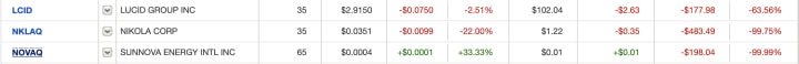 At some point, it was showing as having lost 100% of its value in my position. I don't hope that it will ever recover, again due to the major policy shifts on solar and renewables, so I'm just watching the stock shift from 99% to 100% value loss with almost medical morbid curiosity.