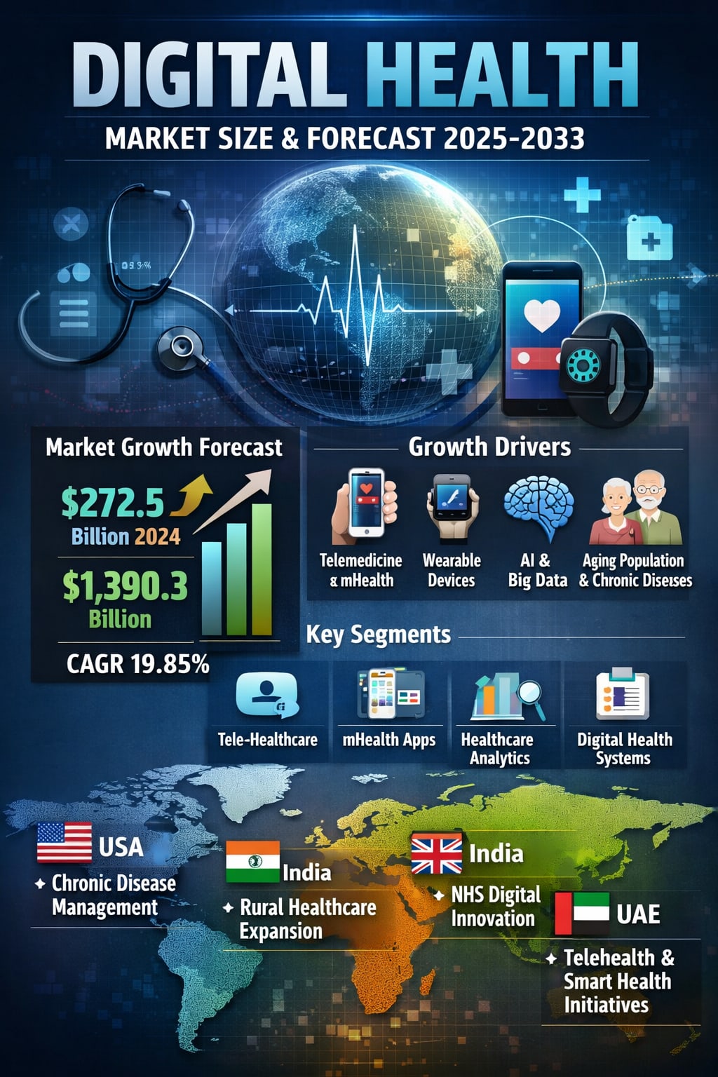 The numbers tell a powerful story. Growing from US$ 272.5 billion in 2024 to US$ 1,390.30 billion by 2033, the digital health market is not just expanding—it is redefining the very foundations of global healthcare.