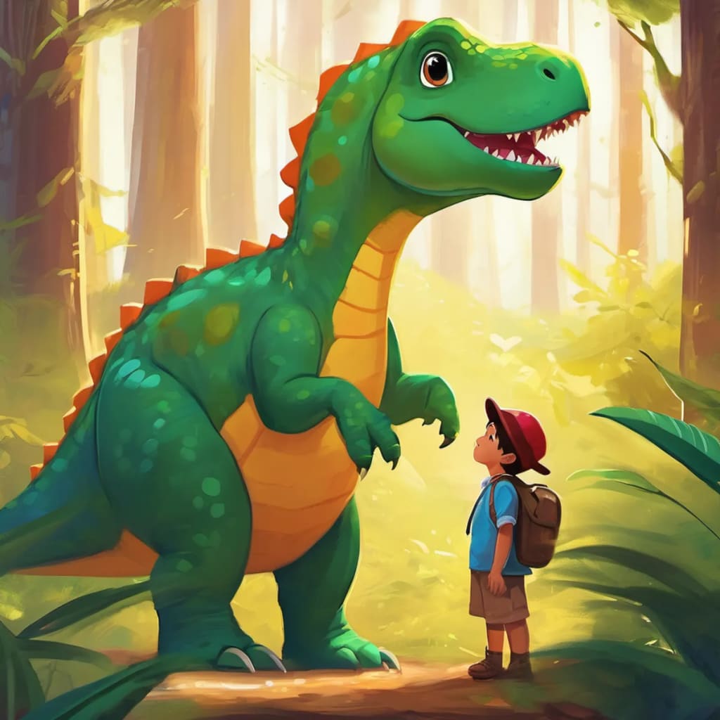 Once upon a time in a land far, far away, there was a cute little dinosaur named Dino. Dino was not just any dinosaur; he had magical powers that allowed him to talk and think like humans. Most importantly, he could grant wishes to anyone who believed in the power of kindness and love. One beautiful sunny day, Dino was exploring the colorful woods. He loved going on new adventures and meeting new friends. As he wandered through the forest, he heard a faint cry for help. Curious and