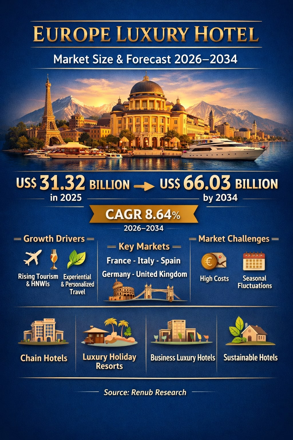 The Europe luxury hotel market is entering a transformative growth phase, driven by international tourism recovery, rising high-net-worth individuals (HNWIs), experiential travel demand, and sustainable hospitality innovation. According to Renub Research, the market is projected to grow from US$ 31.32 Billion in 2025 to US$ 66.03 Billion by 2034, expanding at a CAGR of 8.64% during 2026–2034.