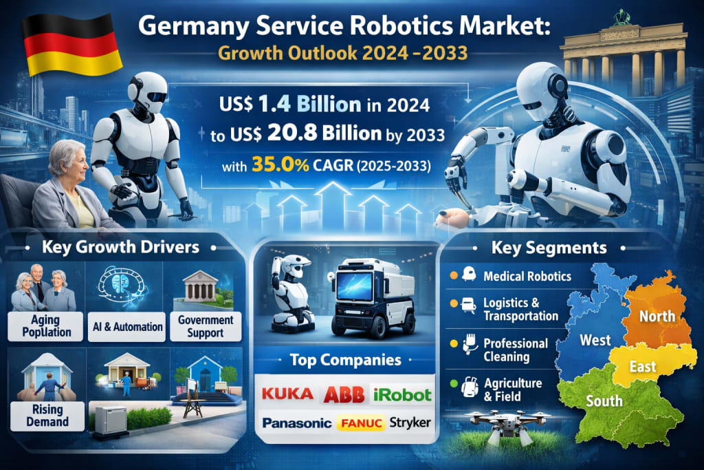According to Renub Research’s latest industry analysis, the Germany Service Robotics Market is expected to expand dramatically, reaching US$ 20.8 billion by 2033 from US$ 1.4 billion in 2024, growing at an impressive CAGR of 35.00% from 2025 to 2033. This rapid rise highlights how service robotics is no longer a niche technology but a foundational pillar of Germany’s digital and industrial transformation.