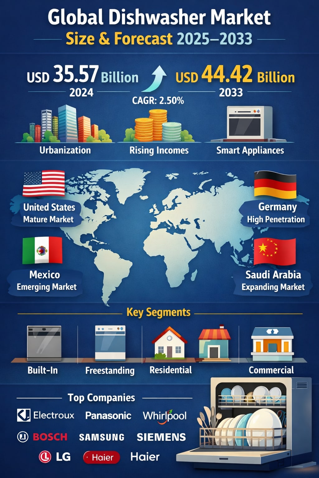 Urbanization is one of the most powerful forces shaping the global appliance market, and dishwashers are no exception. With more people moving to cities and adopting fast-paced lifestyles, the demand for time-saving home solutions continues to rise. Dishwashers are particularly attractive to dual-income households, working professionals, and small families who want to reduce daily household chores.