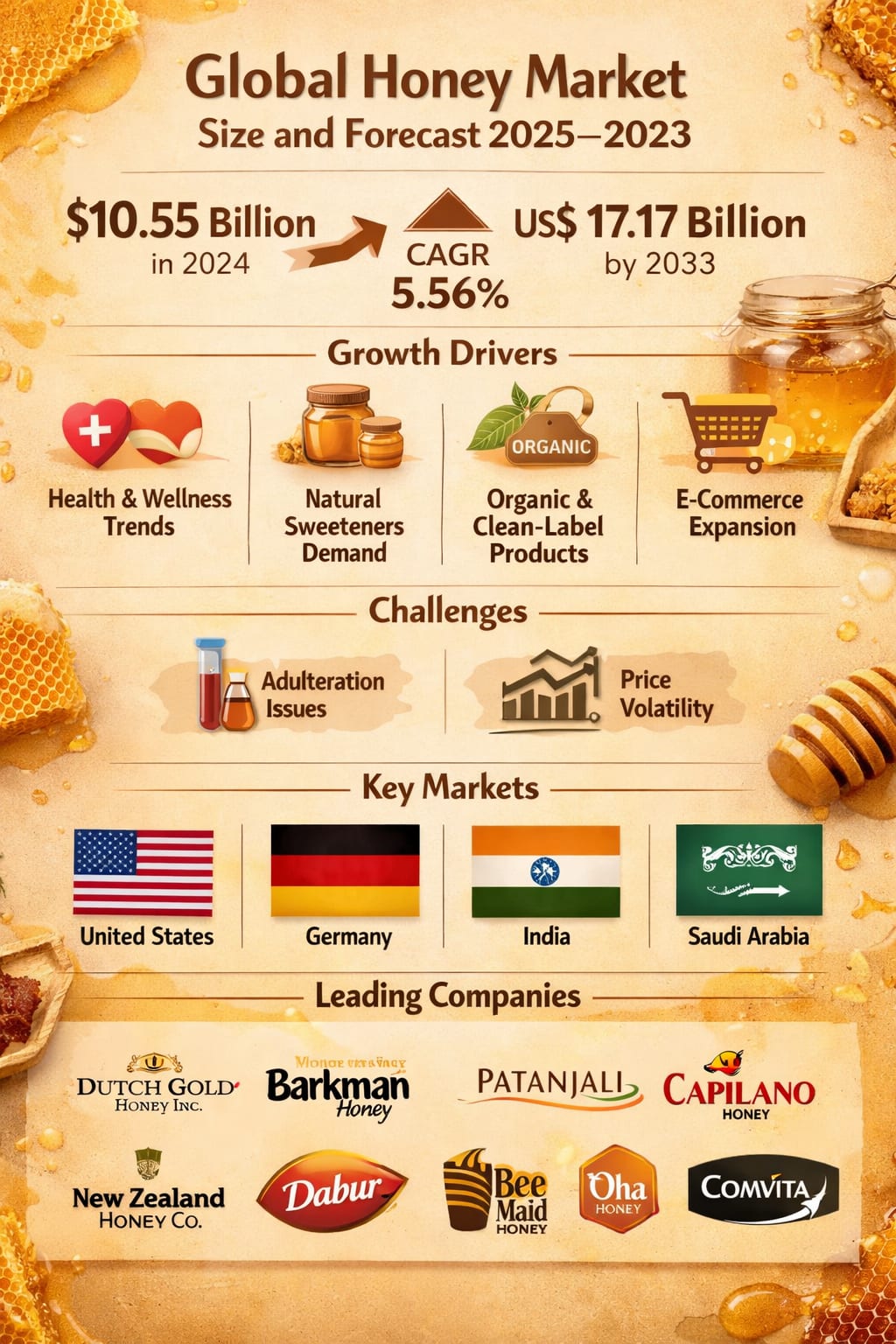 According to Renub Research, the global honey market is expected to reach US$ 17.17 billion by 2033, up from US$ 10.55 billion in 2024, growing at a CAGR of 5.56% from 2025 to 2033. This steady growth reflects not only rising consumption but also the expanding role of honey in multiple industries, from functional foods to beauty and wellness.