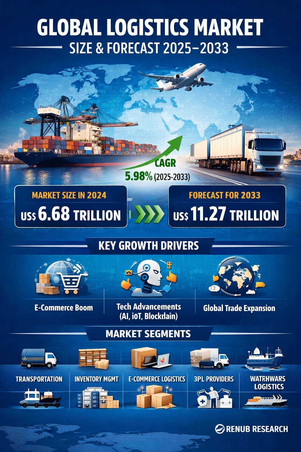 In 2024, the Global Logistics Market was valued at US$ 6.68 trillion and is projected to expand to US$ 11.27 trillion by 2033, growing at a CAGR of 5.98% during 2025–2033, according to Renub Research. This impressive growth trajectory highlights how logistics has become one of the most critical pillars of the modern global economy.
