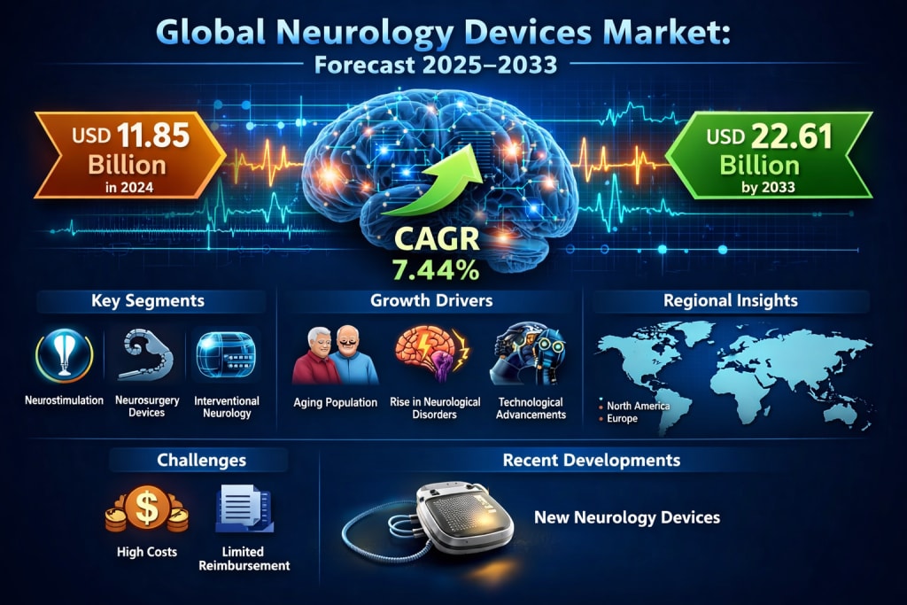 The global neurology devices market is entering a decisive decade, driven by a powerful mix of demographic shifts, technological breakthroughs, and the rising burden of neurological disorders worldwide. According to industry estimates, the Global Neurology Devices Market is expected to reach US$ 22.61 billion by 2033, up from US$ 11.85 billion in 2024, growing at a compound annual growth rate (CAGR) of 7.44% from 2025 to 2033.