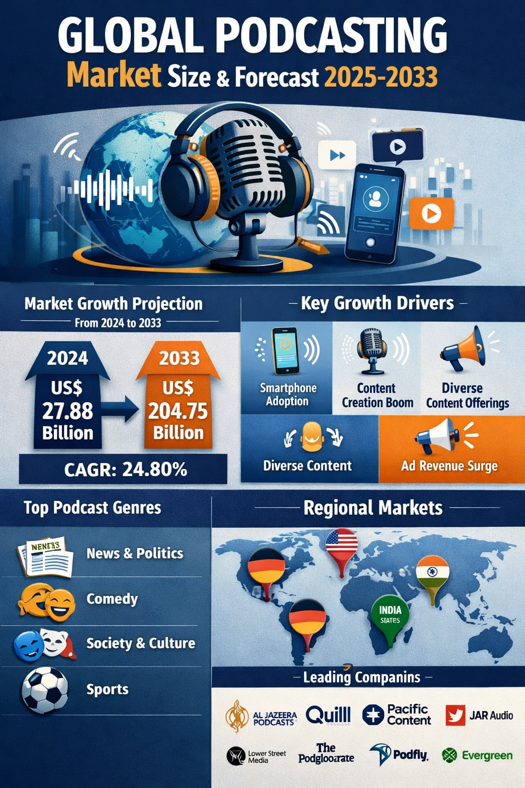 According to industry estimates, the Podcasting Market is expected to reach US$ 204.75 billion by 2033, rising from US$ 27.88 billion in 2024, expanding at an impressive CAGR of 24.80% from 2025 to 2033. This explosive growth reflects not only changing consumer habits but also the increasing confidence of advertisers, platforms, and investors in audio-first and audio-plus (video podcast) content strategies.