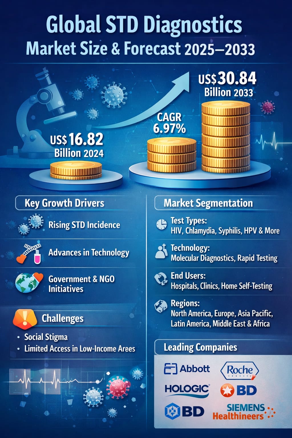 According to Renub Research’s latest industry analysis, the Global STD Diagnostics Market is projected to grow from US$ 16.82 billion in 2024 to US$ 30.84 billion by 2033, expanding at a CAGR of 6.97% during 2025–2033. This impressive growth reflects not only rising infection rates worldwide but also a profound shift in how societies approach sexual health, prevention, and early diagnosis.