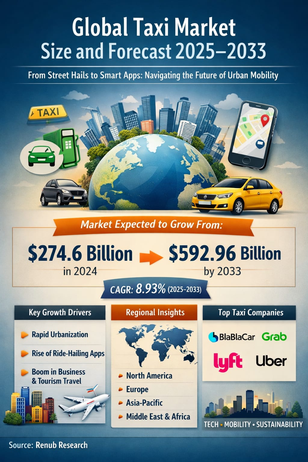 According to Renub Research’s latest industry outlook, the global taxi market is expected to grow from US$ 274.6 billion in 2024 to US$ 592.96 billion by 2033, expanding at a compound annual growth rate (CAGR) of 8.93% from 2025 to 2033. This impressive growth trajectory reflects more than just rising demand for transportation—it signals a fundamental shift in how people move within cities.