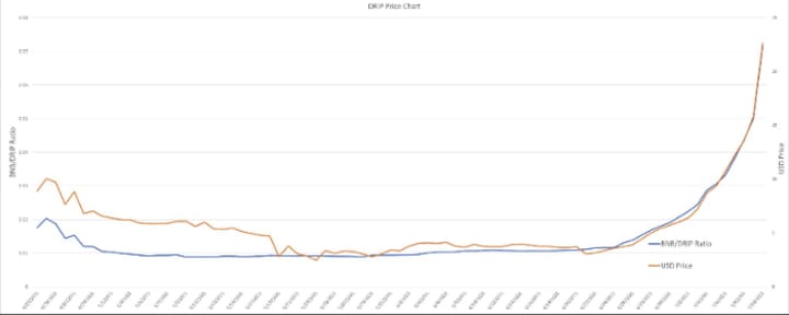 DRIP works like a high-yield certificate of deposit according to their whitepaper. The investor can purchase DRIP directly on their website by using BNB smart token. DRIP is paired to BNB meaning that one variable in the token price fluctuates with BNB’s price. It was created in April of this year and as you can see from the graph below, it has outperformed BNB’s price significantly.