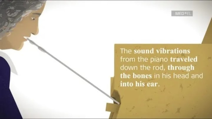 In Beethoven’s case, the vibrations caused by the piano as a source of sound are transmitted through the baton to the jawbone on the side of the mouth, and then from the frontal bone to the inner ear, which eventually formed hearing.