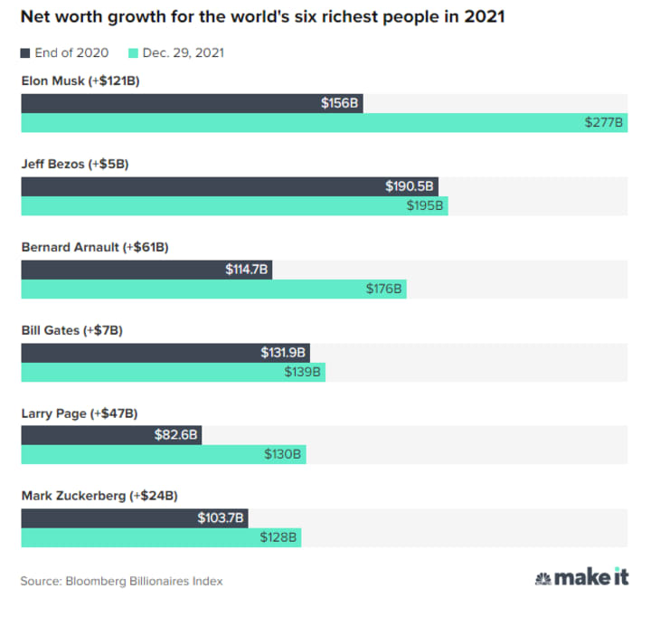 Below is a chart from CNBC Make it, source by Bloomberg to show you the 6 richest people in 2021.