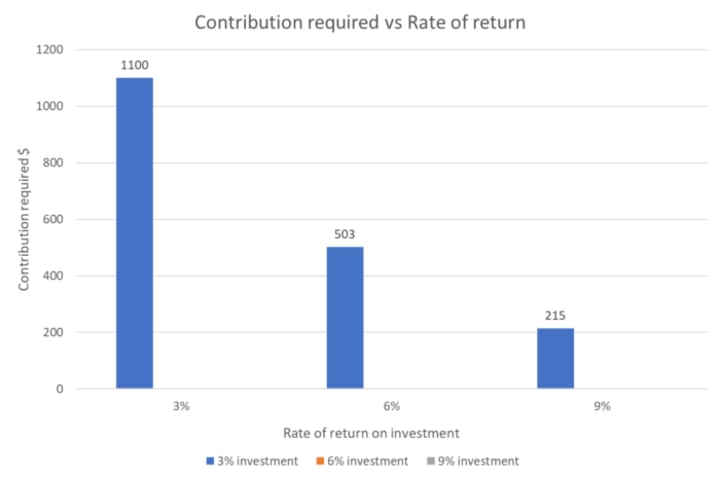 This shows you how critical the rate of return on your investment vehicle is in affecting how much you need to contribute each month. If your investment vehicle is generating a higher return per annum, you would require a lesser amount to contribute compared to if your investments generated a lower rate of return.