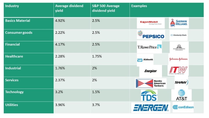 Below is an outline that may give you an idea of the average dividend yield compared to the different industries.