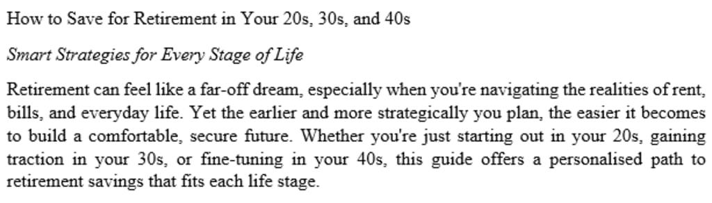 Retirement can feel like a far-off dream, especially when you're navigating the realities of rent, bills, and everyday life. Yet the earlier and more strategically you plan, the easier it becomes to build a comfortable, secure future. Whether you're just starting out in your 20s, gaining traction in your 30s, or fine-tuning in your 40s, this guide offers a personalised path to retirement savings that fits each life stage.