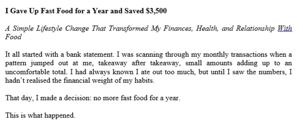 When I broke down my spending, it became painfully clear. In the previous month alone, I had spent over $250 on fast food: burgers, wraps, pizza deliveries, late-night chips. These small “treats” were silently eating away at my financial wellbeing.