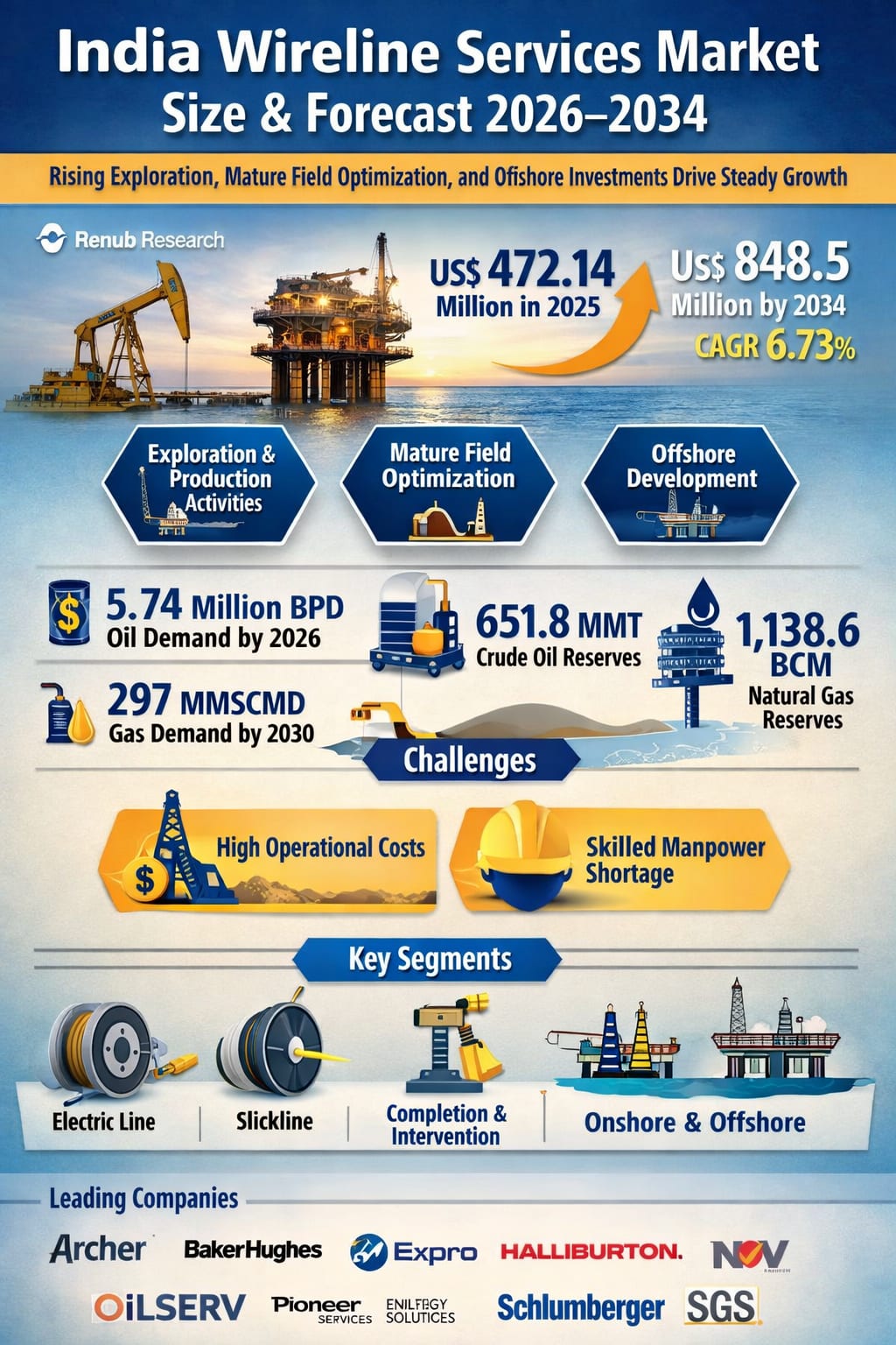One of the most essential components supporting these upstream operations is wireline services. These services play a vital role across the entire lifecycle of a well, from initial formation evaluation to production monitoring and well intervention. According to Renub Research estimates, the India Wireline Services Market is expected to grow from US$ 472.14 million in 2025 to US$ 848.5 million by 2034, registering a compound annual growth rate (CAGR) of 6.73% during the forecast period 2026–2034.
