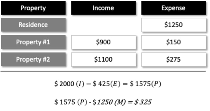 If you observe the calculations above, the two rentals' net income covers the three mortgages' cost, which essentially means no mortgage from your day job.