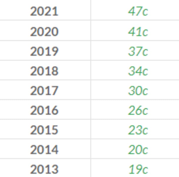 The dividend yield is at 0.56% with the last payment of 0.46 cents per share, with a dividend increase year over year.