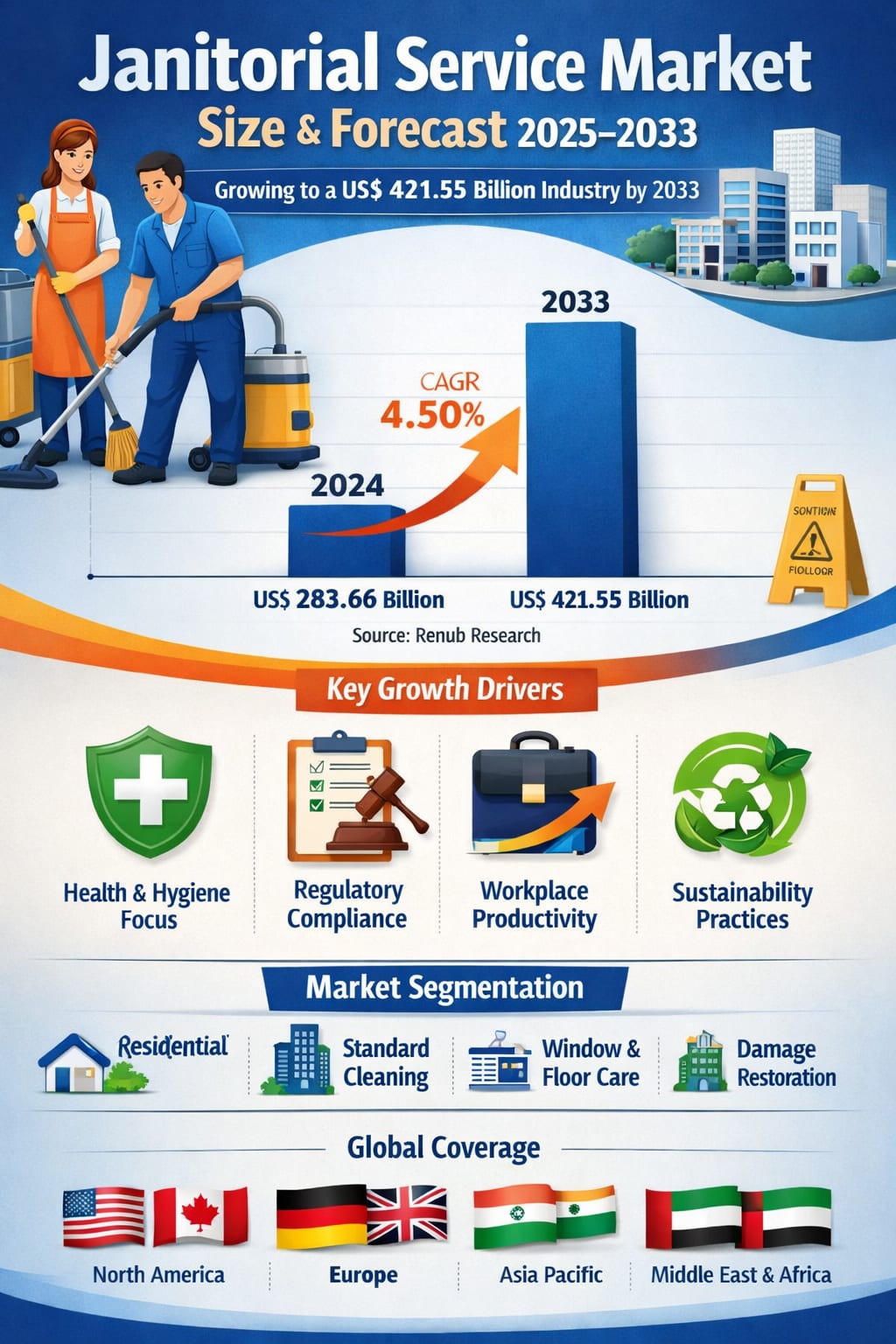 According to Renub Research, the Janitorial Service Market is expected to reach US$ 421.55 billion by 2033, up from US$ 283.66 billion in 2024, expanding at a compound annual growth rate (CAGR) of 4.50% from 2025 to 2033. This steady growth reflects not only rising demand across commercial and residential sectors, but also the increasing complexity of cleaning requirements in modern facilities.