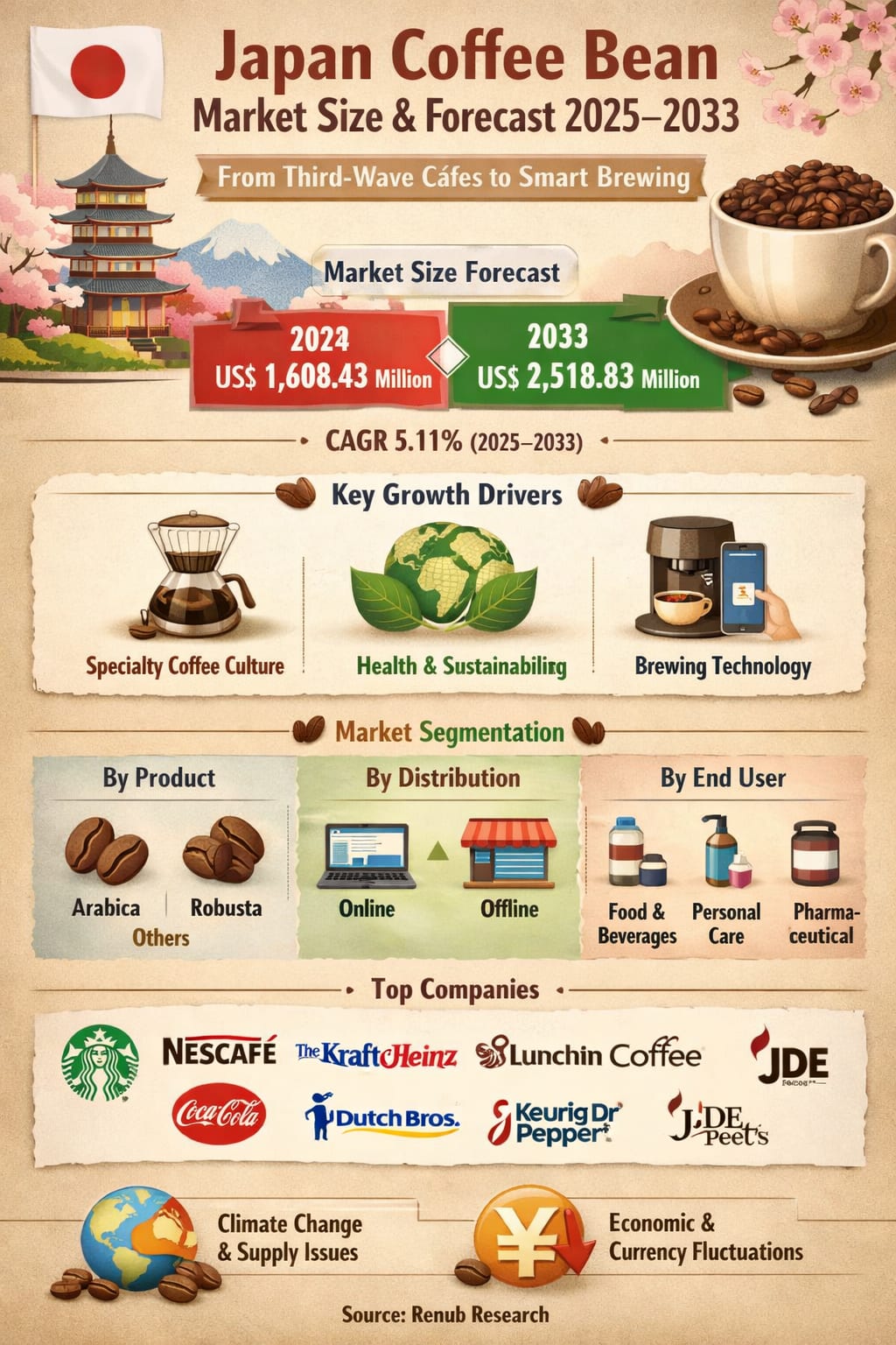 According to Renub Research, the Japan Coffee Bean Market is expected to reach US$ 2,518.83 million by 2033, up from US$ 1,608.43 million in 2024, growing at a CAGR of 5.11% from 2025 to 2033. This consistent growth highlights how deeply coffee has embedded itself into Japan’s daily lifestyle, moving far beyond a simple beverage into a cultural and experiential product.