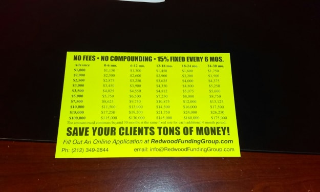 Redwood Funding Group never charges fees and never compounds the interest. One Fixed Rate of 15%. Borrow $1,000, You Owe $150 Every Six Months. That’s It!.