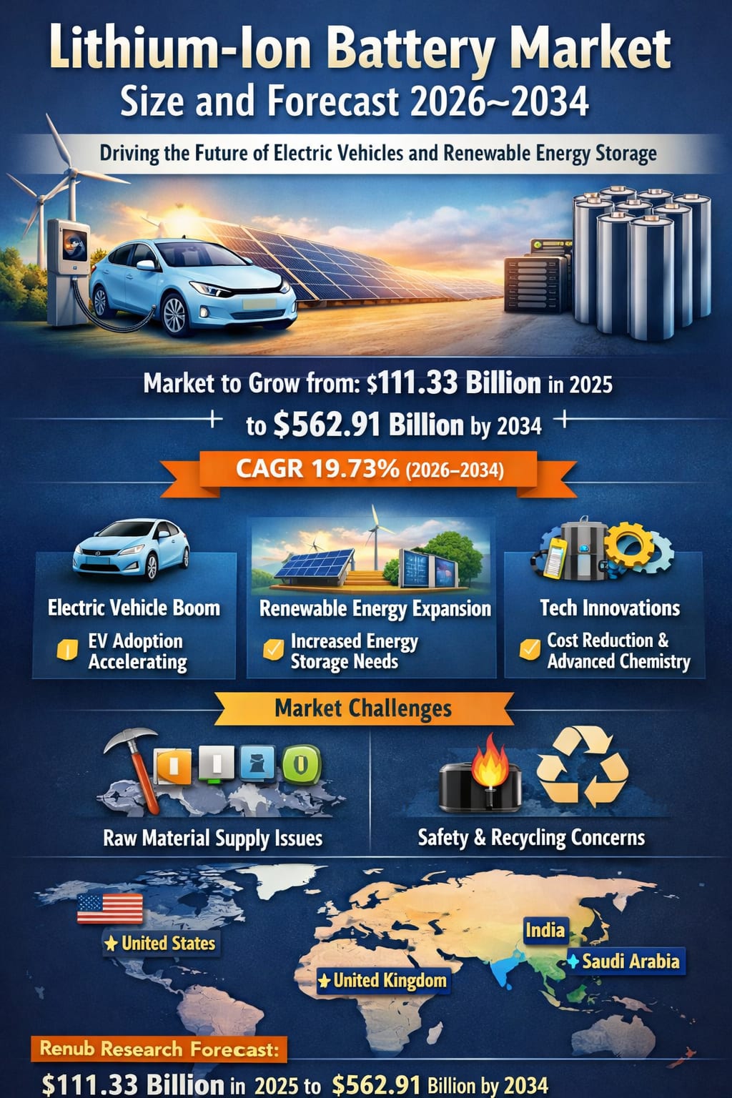 The lithium-ion battery market is entering a transformative decade. With Renub Research projecting growth from US$ 111.33 billion in 2025 to US$ 562.91 billion by 2034, the industry’s future is firmly tied to the global push for electrification, clean energy, and sustainable infrastructure.