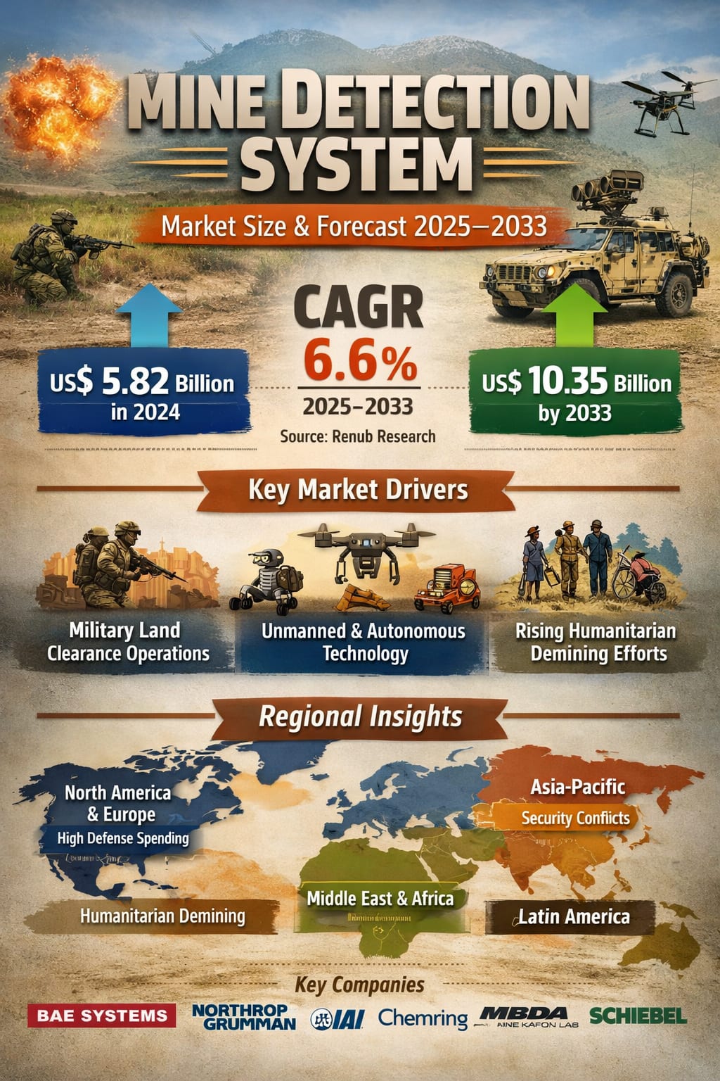 The global mine detection system market is entering a decisive growth phase as nations, humanitarian agencies, and defense organizations intensify efforts to reduce the long-term dangers posed by landmines and unexploded ordnance (UXOs). According to Renub Research, the mine detection system market is expected to reach US$ 10.35 billion by 2033, up from US$ 5.82 billion in 2024, expanding at a compound annual growth rate (CAGR) of 6.6% between 2025 and 2033.