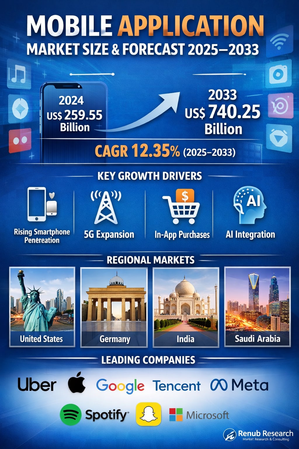 According to Renub Research, the Mobile Application Market is expected to reach US$ 740.25 billion by 2033, up from US$ 259.55 billion in 2024, growing at a robust CAGR of 12.35% from 2025 to 2033. This impressive growth reflects how deeply mobile apps are embedded in daily life and how rapidly businesses are shifting toward digital, app-based engagement models.