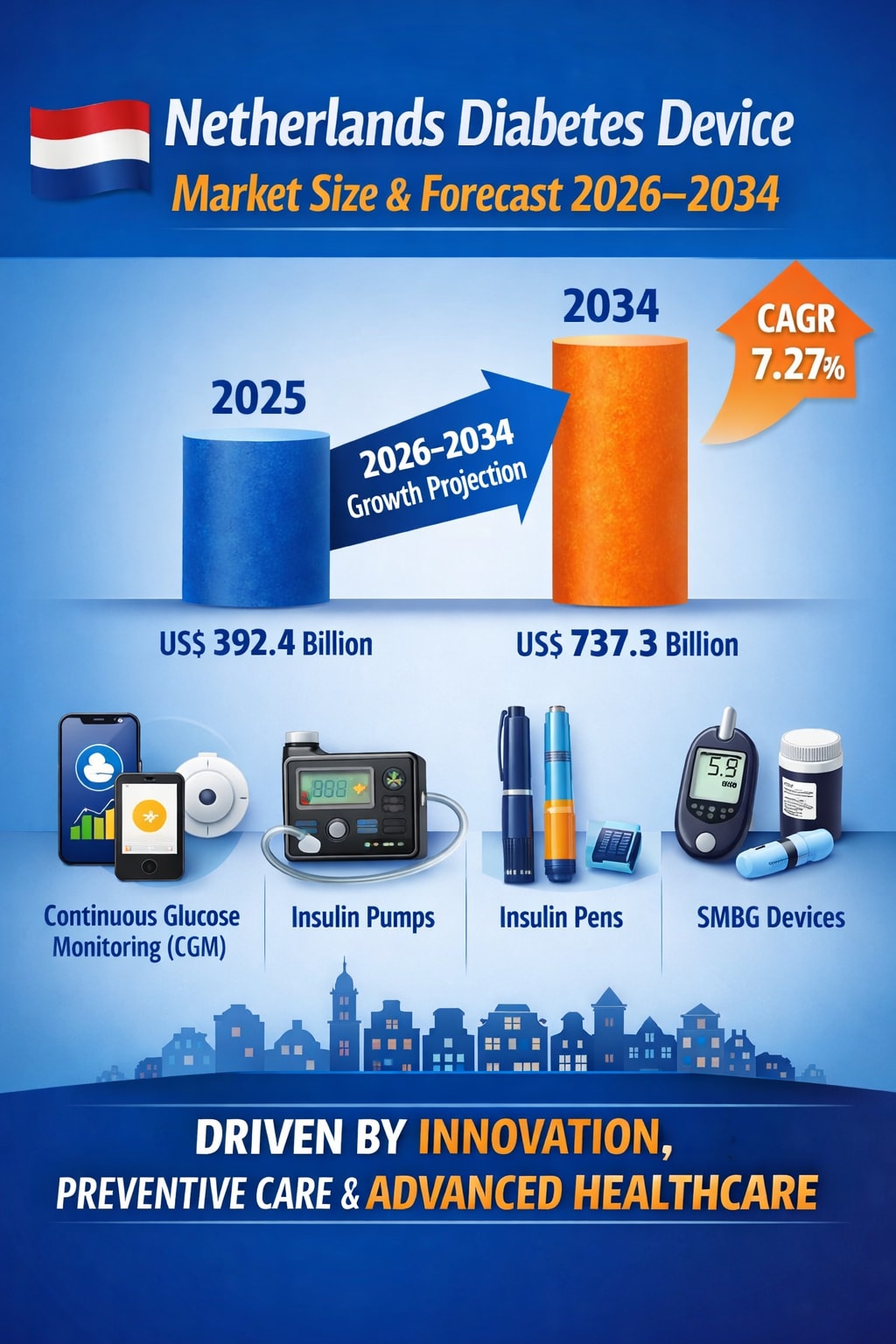 The market for diabetes-care devices in the Netherlands is entering a decisive growth phase, supported by rising disease prevalence, rapid adoption of digital health technologies, and one of Europe’s most advanced healthcare systems. According to industry projections, the Netherlands diabetes devices market is expected to grow from US$ 392.4 billion in 2025 to US$ 737.3 billion by 2034, registering a compound annual growth rate (CAGR) of 7.27% during 2026–2034.
