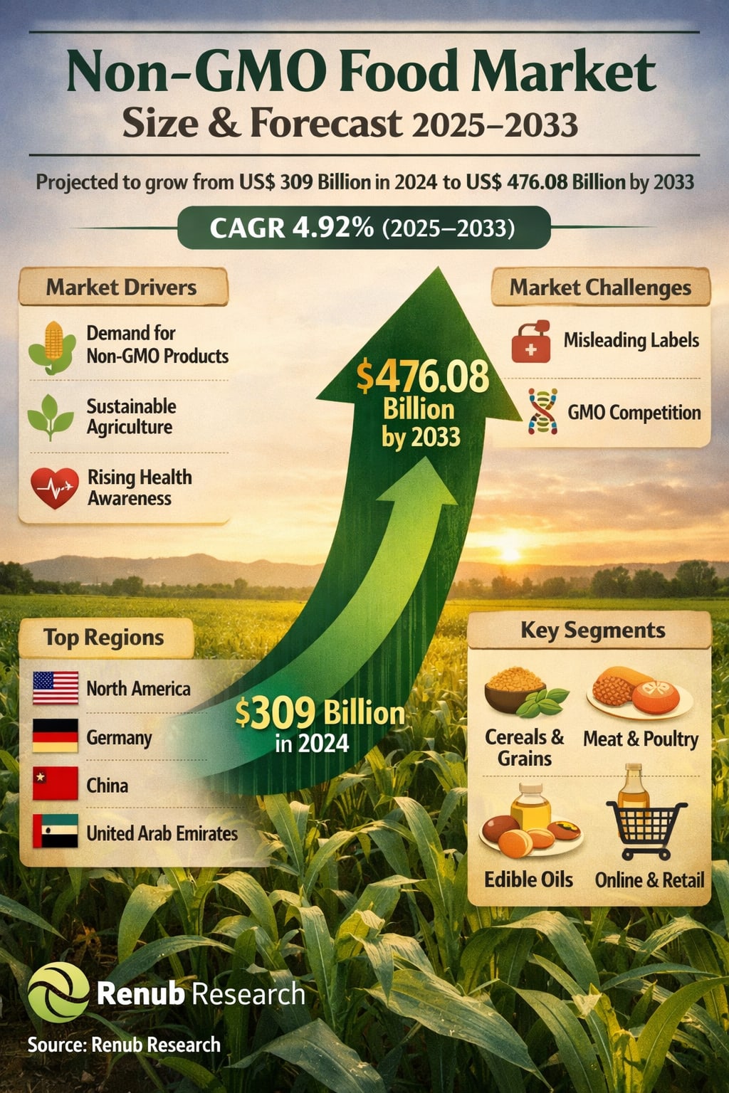 According to Renub Research’s latest publication, “Non-GMO Food Global Market Report by Product Type, Distribution Channel, Countries and Company Analysis, 2025–2033”, the Non-GMO Food Market is expected to reach US$ 476.08 billion by 2033, rising from US$ 309 billion in 2024, at a compound annual growth rate (CAGR) of 4.92% from 2025 to 2033.