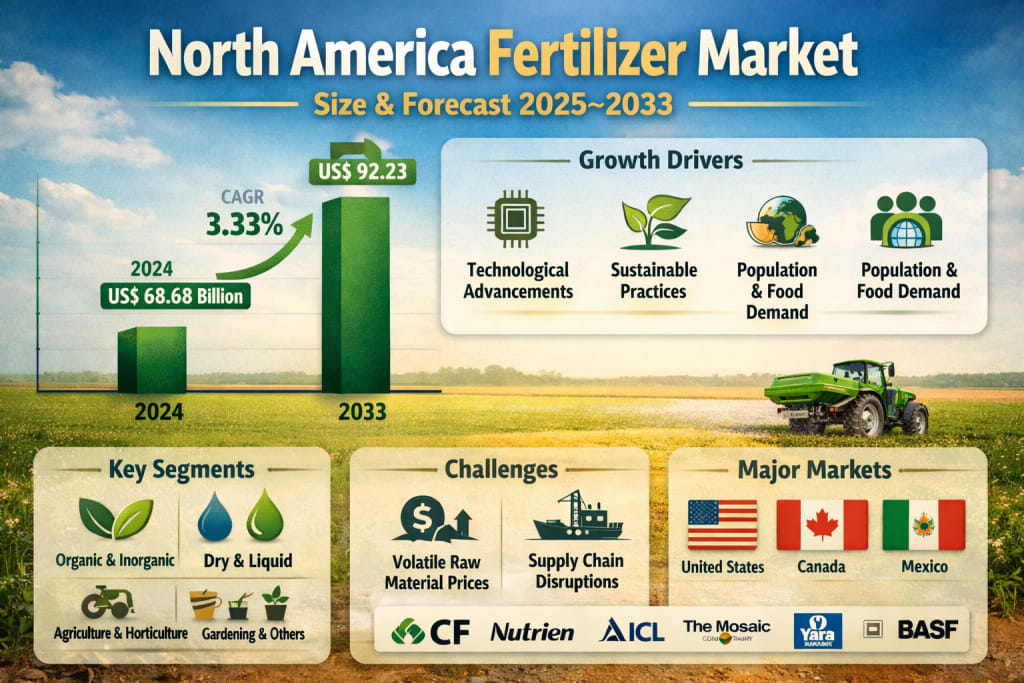 The North America Fertilizer Market is entering a decisive decade of transformation. According to Renub Research, the market is expected to reach US$ 92.23 billion by 2033, rising from US$ 68.68 billion in 2024, at a CAGR of 3.33% from 2025 to 2033. This steady growth reflects more than just rising demand for food—it signals a structural shift in how agriculture is practiced across the United States, Canada, and Mexico.