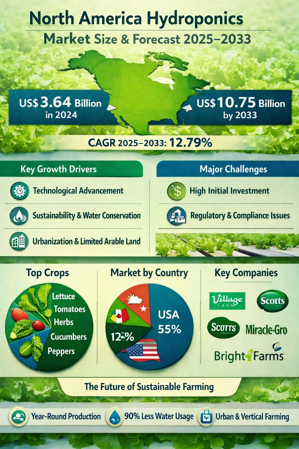 The North America hydroponics market is entering a decisive decade. With the market expected to grow from US$ 3.64 billion in 2024 to US$ 10.75 billion by 2033, hydroponics is no longer a futuristic concept—it is becoming a core component of the region’s food system.