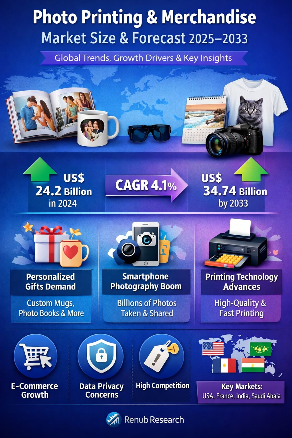 The Global Photo Printing and Merchandise Market was valued at US$ 24.2 billion in 2024 and is projected to reach US$ 34.74 billion by 2033, expanding at a CAGR of 4.1% between 2025 and 2033. This steady growth trajectory reflects a powerful mix of emotional consumer behavior and technological progress. Rising demand for personalized gifts, rapid improvements in digital printing technologies, and the growing popularity of photo-based merchandise through online platforms and e-commerce channels are among the primary forces shaping the market.