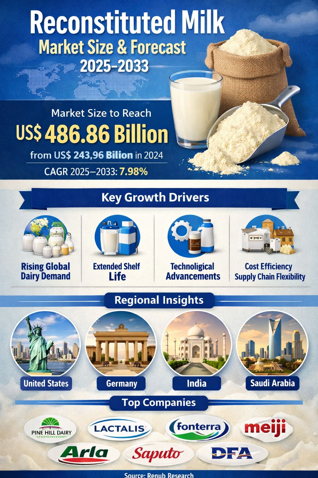According to Renub Research, the Reconstituted Milk Market is expected to reach US$ 486.86 billion by 2033, up from US$ 243.96 billion in 2024, growing at a CAGR of 7.98% from 2025 to 2033. This impressive expansion reflects more than just rising dairy consumption—it signals a shift in how the world produces, distributes, and consumes milk.