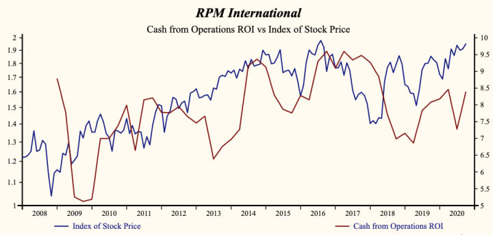 RPM International Inc. (NYSE:RPM) has been an unprofitable company with frequently low cash return on total capital of 7.6% on average over the past 21 years. Over the long term the shares of RPM International Inc have advanced by 29% relative to the broad market index.