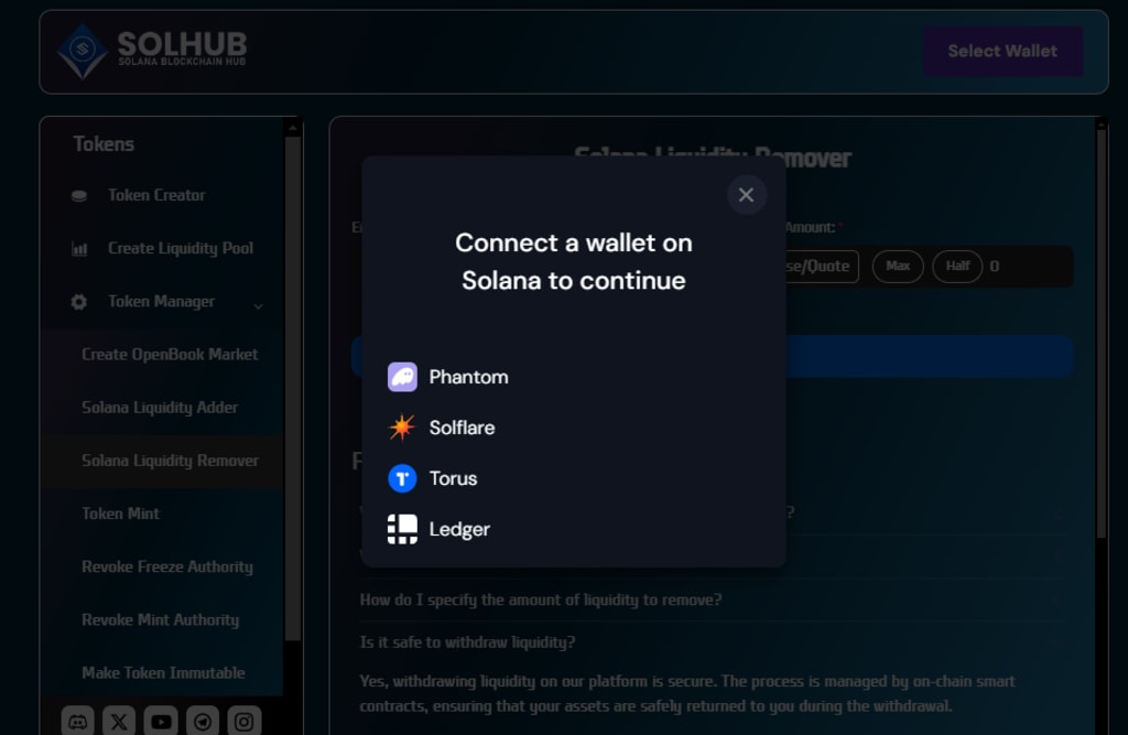 First, go to the Solana Liquidity Remover home page. On the right end of the page, there will be the link ‘Sele ct Wallet’. Click on it to connect your wallet. The available wallets are: