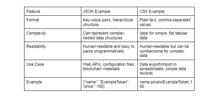 Token metadata can be uploaded in several possible formats with the two most popular file formats being JSON and CSV formats. Both of them have their own characteristics and if you need something specific for your project, then it is worth referring to the type of format you need.