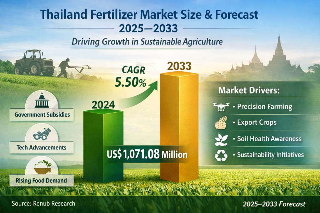 According to Renub Research’s latest industry assessment, the Thailand Fertilizer Market is expected to reach US$ 1,732.51 million by 2033, growing from US$ 1,071.08 million in 2024, at a compound annual growth rate (CAGR) of 5.50% from 2025 to 2033. This steady expansion reflects Thailand’s strong agricultural foundation, rising food demand, increasing export-oriented crop production, and a gradual shift toward more efficient and sustainable farming practices.