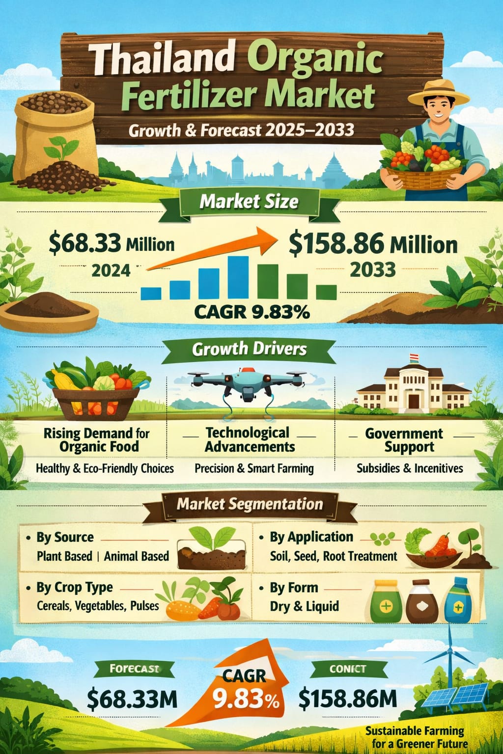 With the Thailand Organic Fertilizer Market projected to grow from US$ 68.33 million in 2024 to US$ 158.86 million by 2033, the next decade looks highly promising for this sector. The expected CAGR of 9.83% reflects not just rising demand, but also a structural shift in how agriculture is practiced in the country.