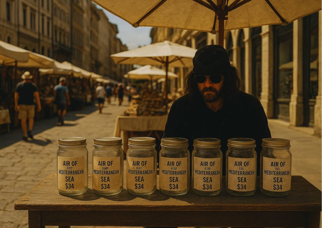 A middle-aged man approached, curious but skeptical. His gaze quickly scanned the jars, noticing the label. He sighed, irritated by the absurdity of the thing, but couldn’t take his eyes off the object that almost seemed like a trap. He decided to make a game of it, to mock the vendor a little, without really intending to buy anything.