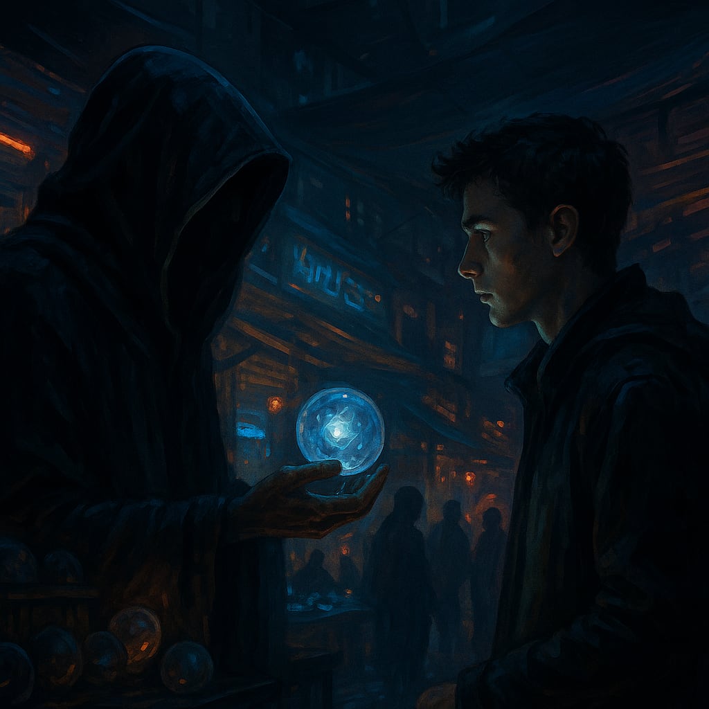 The Merchant was tall, cloaked in tattered neural weaves, and his face shimmered with residual memory flicker—like a thousand identities barely contained. He greeted Joren with a voice like silk dipped in static.
