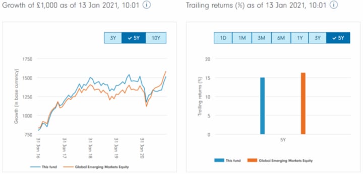 a) On the left: this shows the fluctuations in the fund’s returns (in blue) versus its benchmark (an index chosen as a relevant comparison to evaluate the fund’s performance against). The chart visualizes what £1,000 invested on a given date would amount to across a 3, 5, or 10-year timeframe. In other words, it gives you an idea of the growth potential of the fund over the time period.