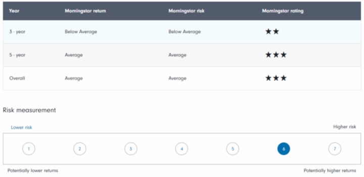 What does this data tell us? You can see a star-rating representing the overall performance of the fund. Underneath, the risk level is displayed on a simple 1 to 7 scale.