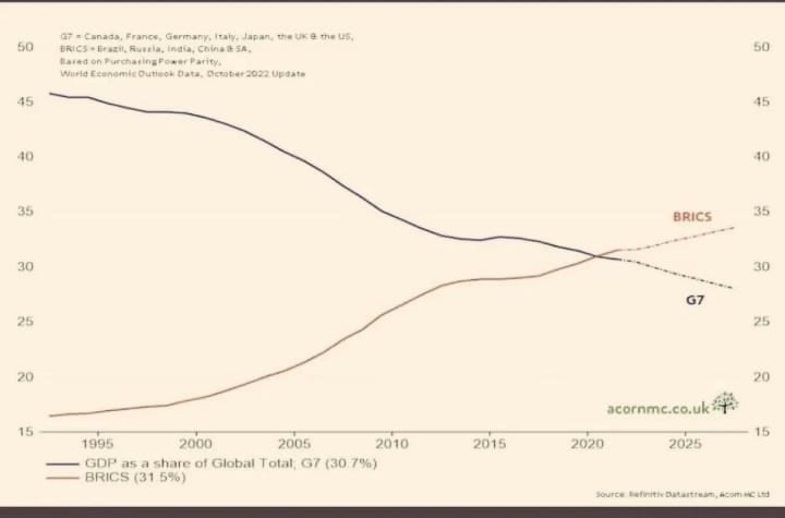 A significant milestone was reached this week when the BRICS countries (Brazil, Russia, India, China, South Africa, Bangladesh, Egypt, and UAE) surpassed the G7 (Canada, France, Germany, Italy, Japan, UK, and EU) in GDP. This shift in economic power calls into question the distinction between the developed and developing world. The new reality is an "ascending and descending world," with emerging economies gaining ground while established powers stagnate.