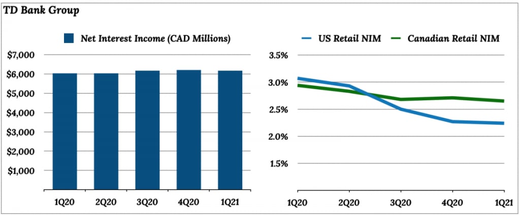Interest income isn't the only thing that matters. TD is not the only bank that has seen a boost in non-interest income during this downturn. While the numbers were up last year due to the TD Ameritrade gain, the underlying performance is now better. There are still some areas that remain subdued. Credit card fees are still lower than pre-COVID levels. Other lines, such as transaction-based Wealth and fee, have made up the difference. The non-interest income from the Canadian retail sector grew 11% last quarter to C$3.4b. This is more than offset by the tougher numbers south.