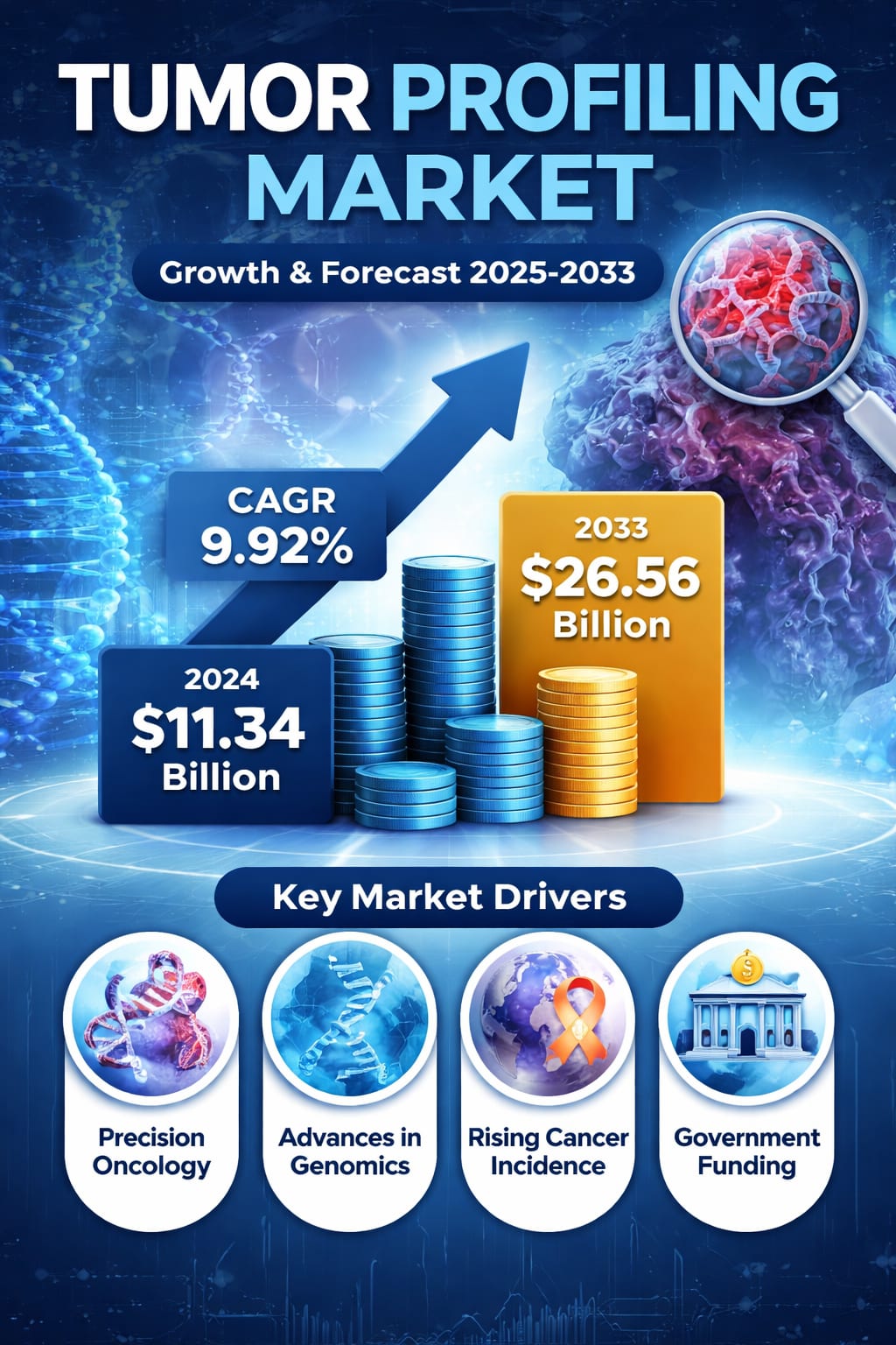 According to Renub Research, the Global Tumor Profiling Market is expected to reach US$ 26.56 billion by 2033, up from US$ 11.34 billion in 2024, growing at a CAGR of 9.92% from 2025 to 2033. This impressive growth reflects a broader shift toward precision oncology, rising global cancer incidence, and rapid advances in technologies such as next-generation sequencing (NGS), polymerase chain reaction (PCR), and mass spectrometry.