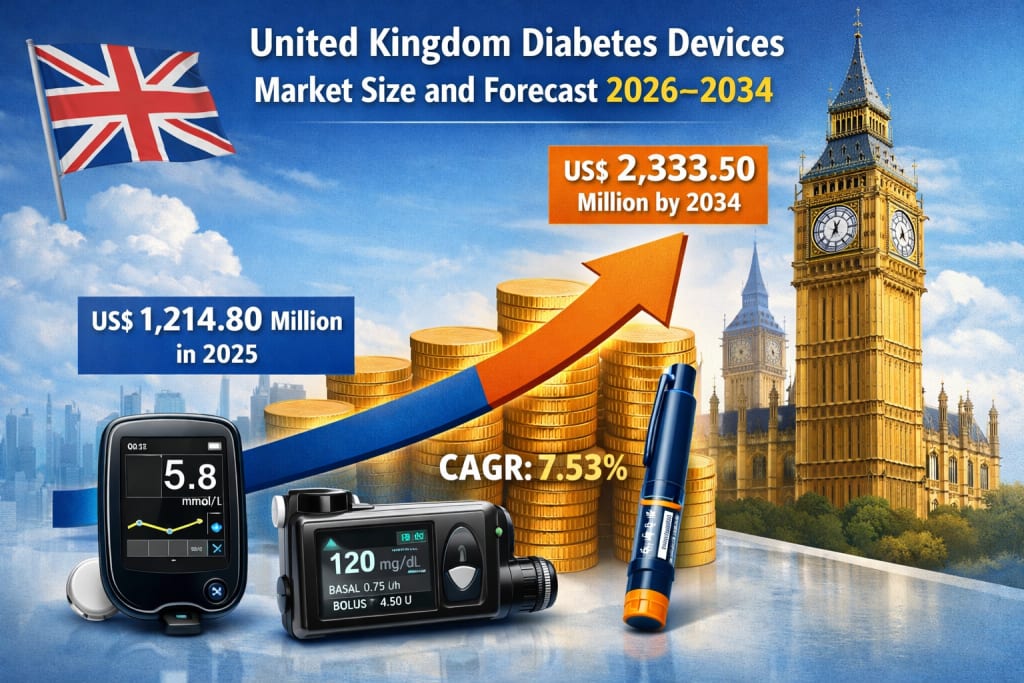 The United Kingdom diabetes devices market is entering a phase of steady and technology-driven expansion, reflecting both the rising burden of diabetes and the healthcare system’s growing emphasis on early diagnosis, continuous monitoring, and long-term disease management. According to Renub Research, the market is expected to grow from US$ 1,214.80 million in 2025 to US$ 2,333.50 million by 2034, registering a compound annual growth rate (CAGR) of 7.53% from 2026 to 2034.