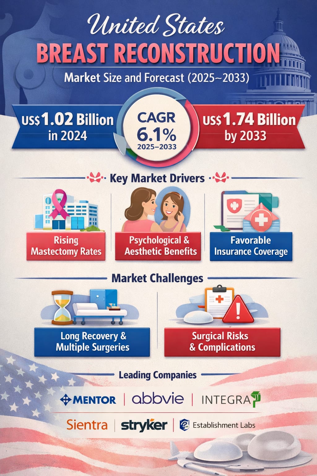 The United States breast reconstruction market is entering a period of steady and meaningful expansion, shaped by a powerful mix of medical progress, rising breast cancer survival rates, and growing awareness of reconstructive options among patients. According to Renub Research, the United States Breast Reconstruction Market is expected to reach US$ 1.74 billion by 2033, up from US$ 1.02 billion in 2024, growing at a compound annual growth rate (CAGR) of 6.1% from 2025 to 2033.